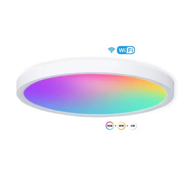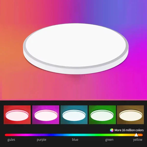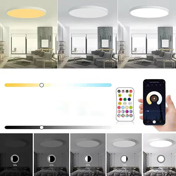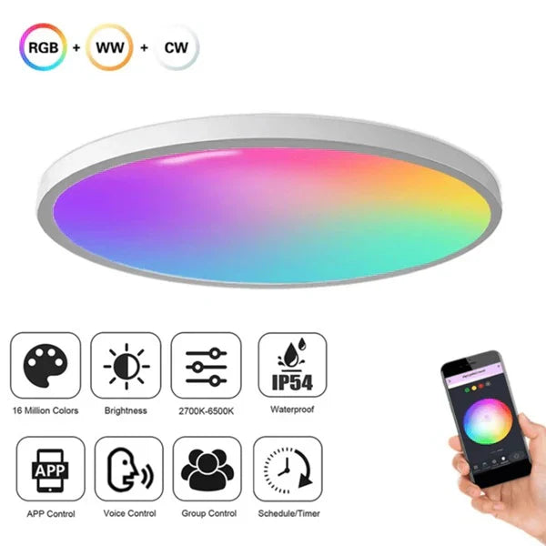 Pametna LED plafonjera nudi prilagodljivost svetlosti putem aplikacije i daljinskog upravljača. Pruža širok spektar boja i intenziteta svetla.