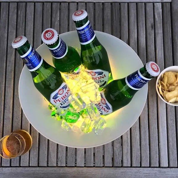 Unesite svetlosnu atmosferu u svaku proslavu uz RGB kiblu za hlađenje pića! Ova moderna LED kanta za led ne samo da održava vaša pića hladnim, već ih i osvetljava u različitim bojama, stvarajući efektnu dekoraciju na svakom događaju – od kućnih žurki do baštenskih večera.