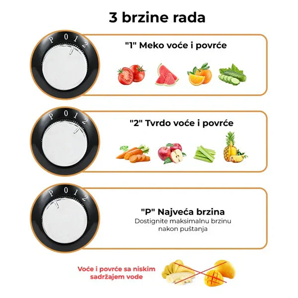 - Dve brzine rada: Sporija brzina za mekano voće i brža za tvrđe sastojke.